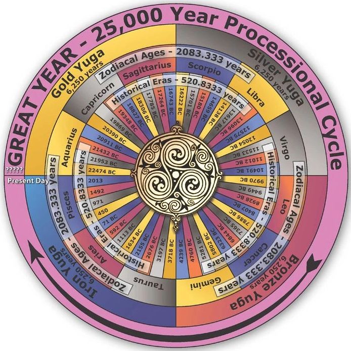 There are cycles within each astrological age. Every 2160 years, there is an age that contains twelve smaller periods known as 'eras' that span 180 years each, and within each era, there are twelve phases that last for 15 years each. These smaller cycles indicate the progression of evolution within the larger cycle, but for some reason, they flow in a forward direction through the zodiac. While time appears to flow both forward and backward within the same astrological structure, these smaller periods make it possible to date the astrological ages with greater accuracy. They also indicate that the Western Gregorian calendar aligns with these ages. The Age of Pisces began at the point known as 0 BC, as the symbolism of the eras and phases accurately matches the timing of historical events. Eras and phases move forward through the signs of the zodiac, while the ages proceed backward. the recurring cycle of periods of the Renaissance (Sagittarius), classical periods (Capricorn), and scientific periods (Aquarius) that occur at the height of each age, and plant new seeds that will blossom in the upcoming new age.